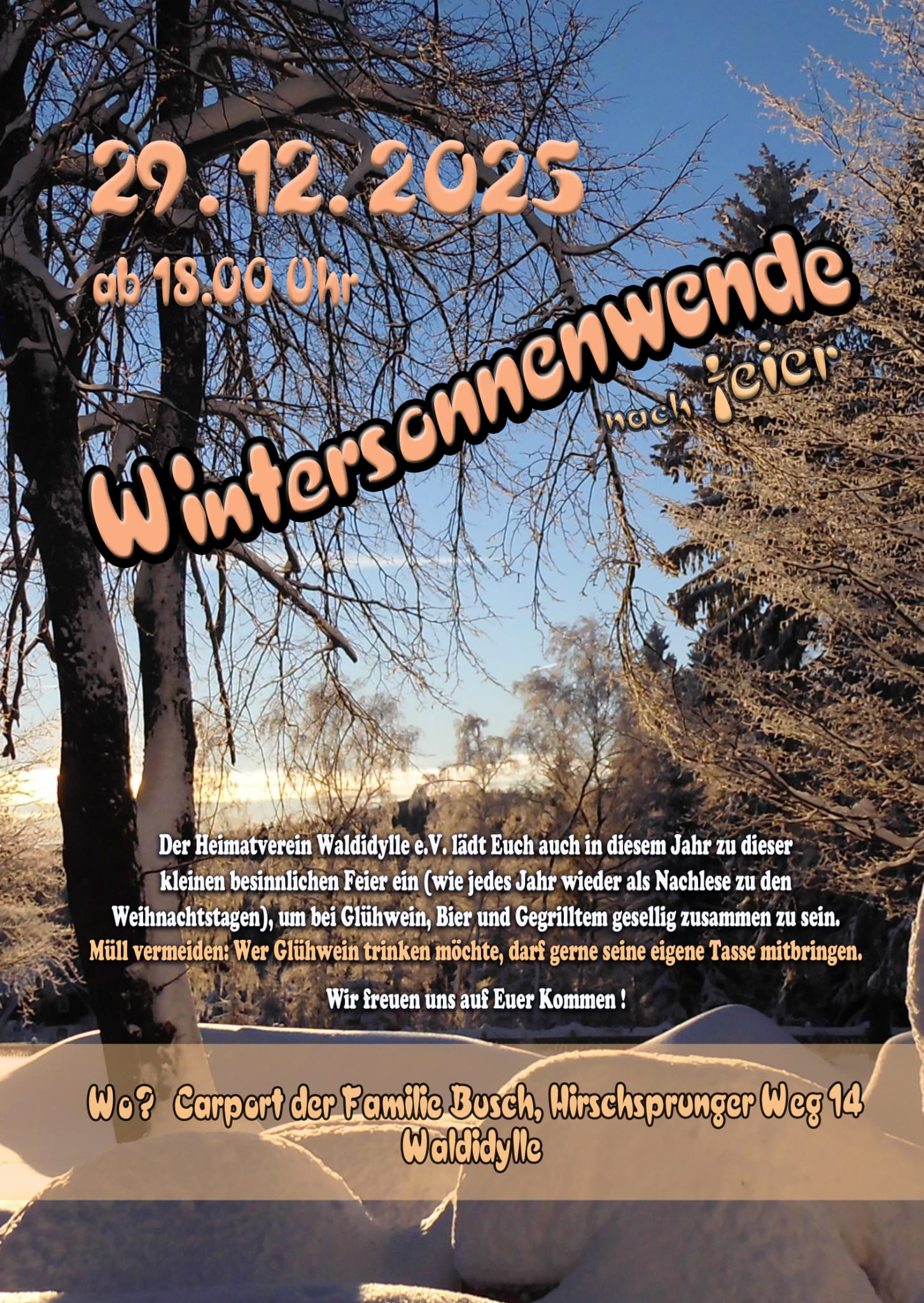 Der Heimatverein Waldidylle e.V. lädt euch auch in diesem Jahr zu dieser kleinen besinnlichen Feier ein (als Nachlese zu den Weihnachtstagen), um bei Glühwein, Bier und Gegrilltem gesellig beisammen zu sein.